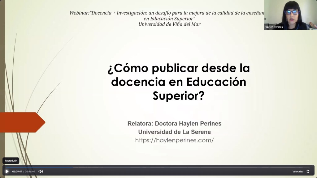 Expositora Webinar «Docencia+Investigación: un desafío para la mejora de la calidad de la enseñanza en Educación Superior», dirigido a los estudiantes del Magíster en Educación Superior de la Universidad de Viña del Mar, modalidad online, 16 de abril 2020 http://userena.cl/actualidad/4404-investigadora-es-parte-de-seminario-online-sobre-calidad-de-la-ense%C3%B1anza-en-educaci%C3%B3n-superior.html
